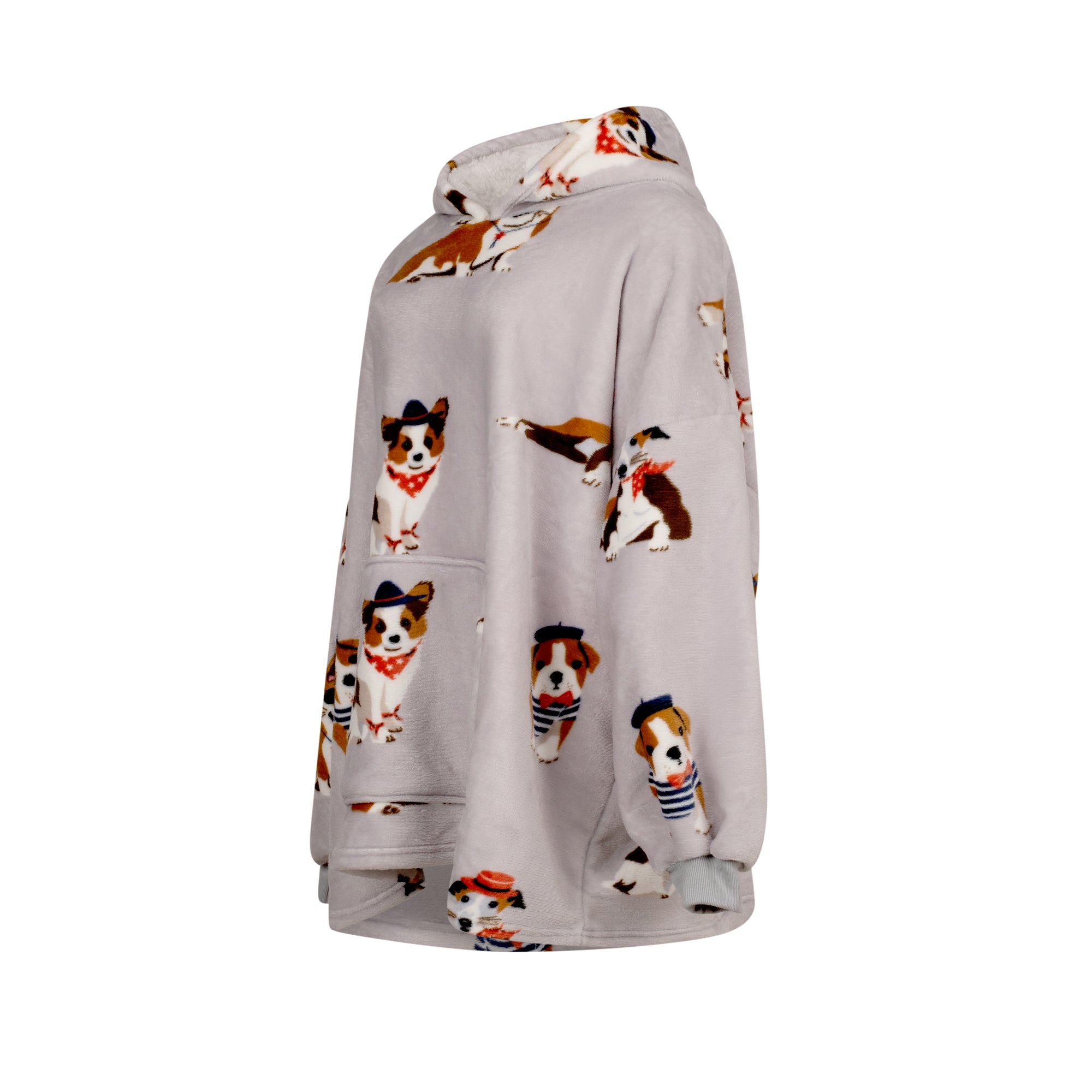 Elevate your winter wardrobe with our Poochies Oversized Wearable Hoodie! Featuring stylish dogs decked out in hats, kerchiefs, and t-shirts, this cozy sherpa fleece hoodie combines warmth with playful fashion. Perfect for both adults and children, it’s designed as a wearable blanket, offering a roomy and comfortable fit for lounging at home or stepping out in casual style.