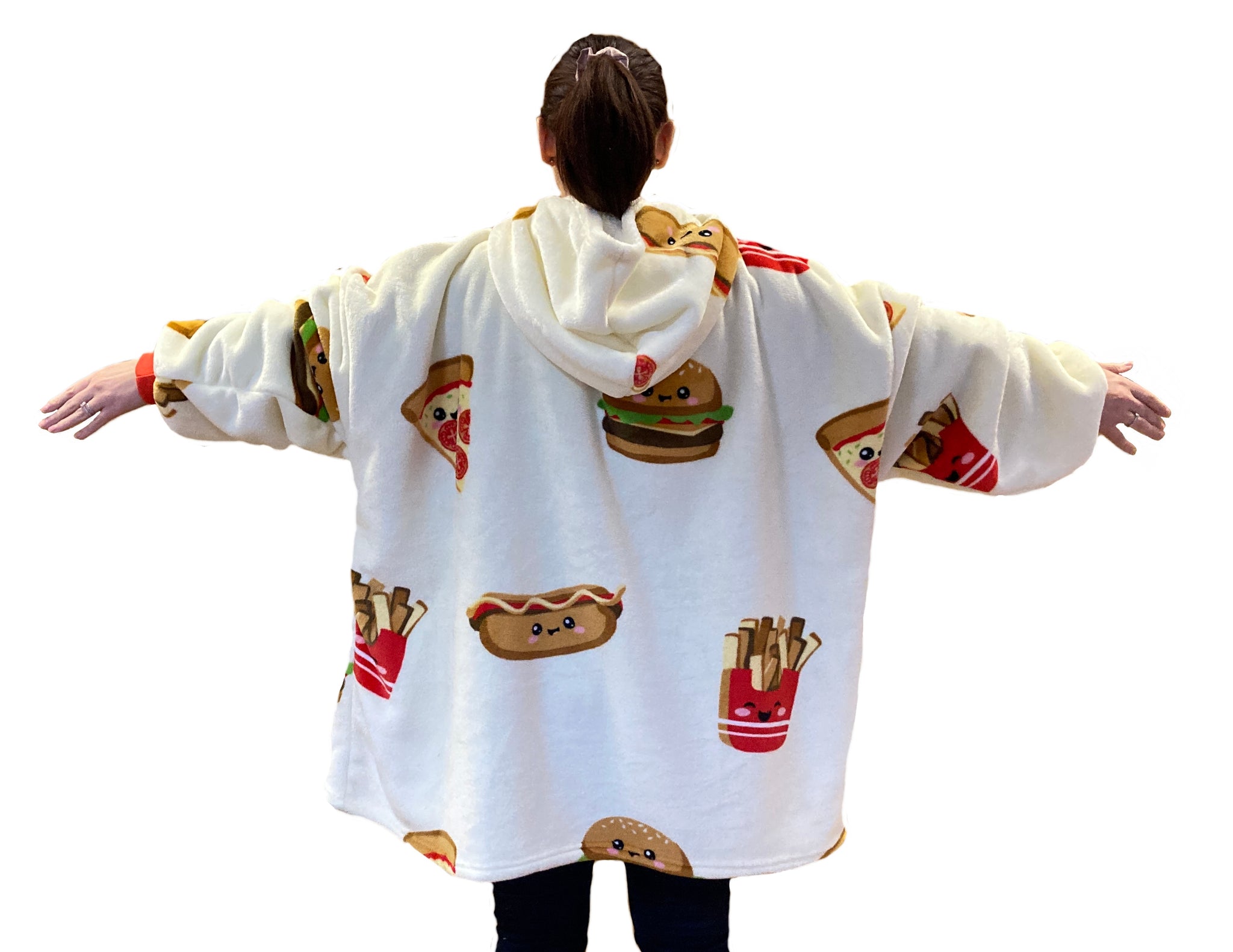 Satisfy your cravings for both comfort and style with our Fast Food Oversized Wearable Hoodie—the perfect blend of cozy warmth and playful personality. Set against a smooth creamy backdrop, this fun design features a delicious mix of pizzas, chips, burgers, and all your favorite guilty pleasures, turning your winter wardrobe into a feast of color and charm.